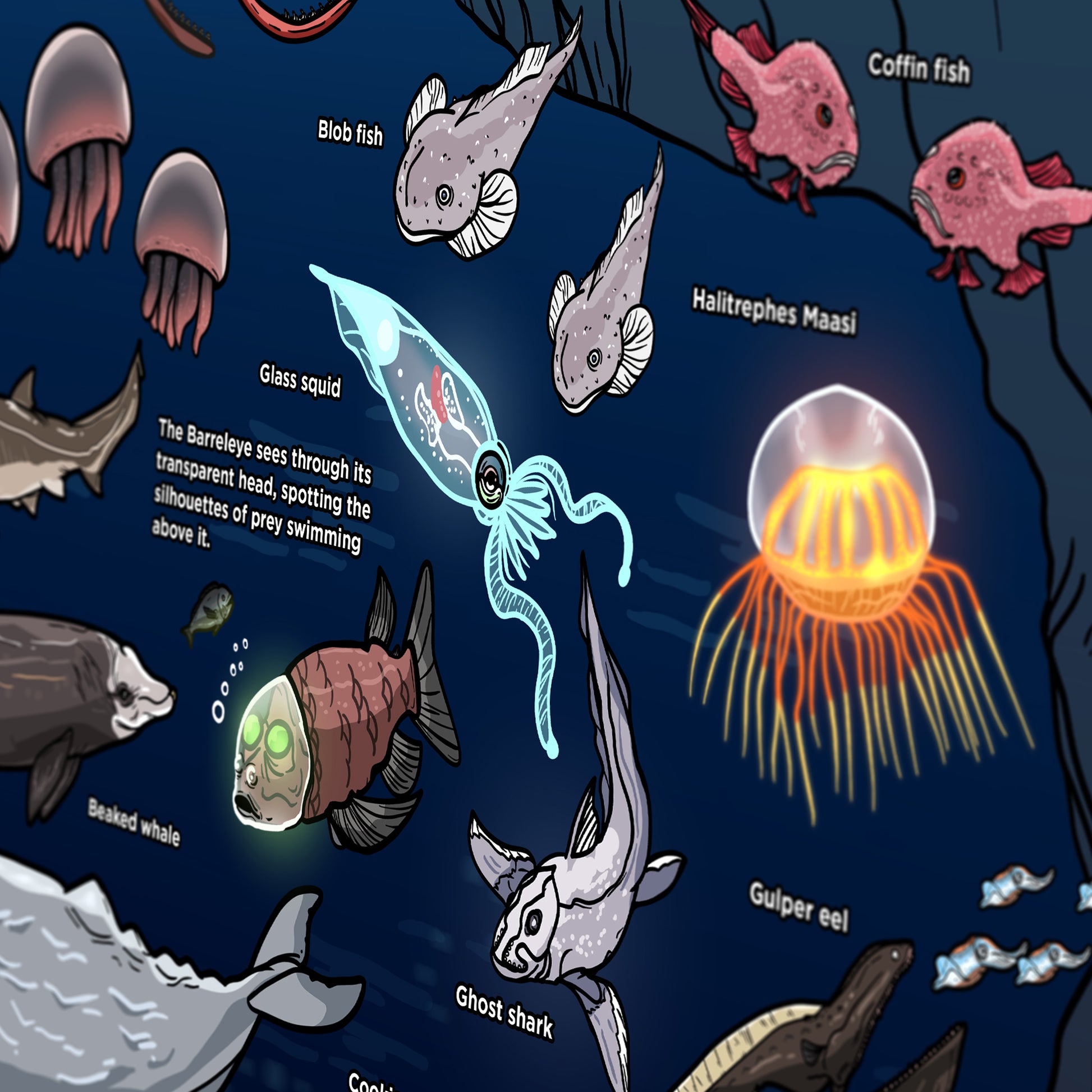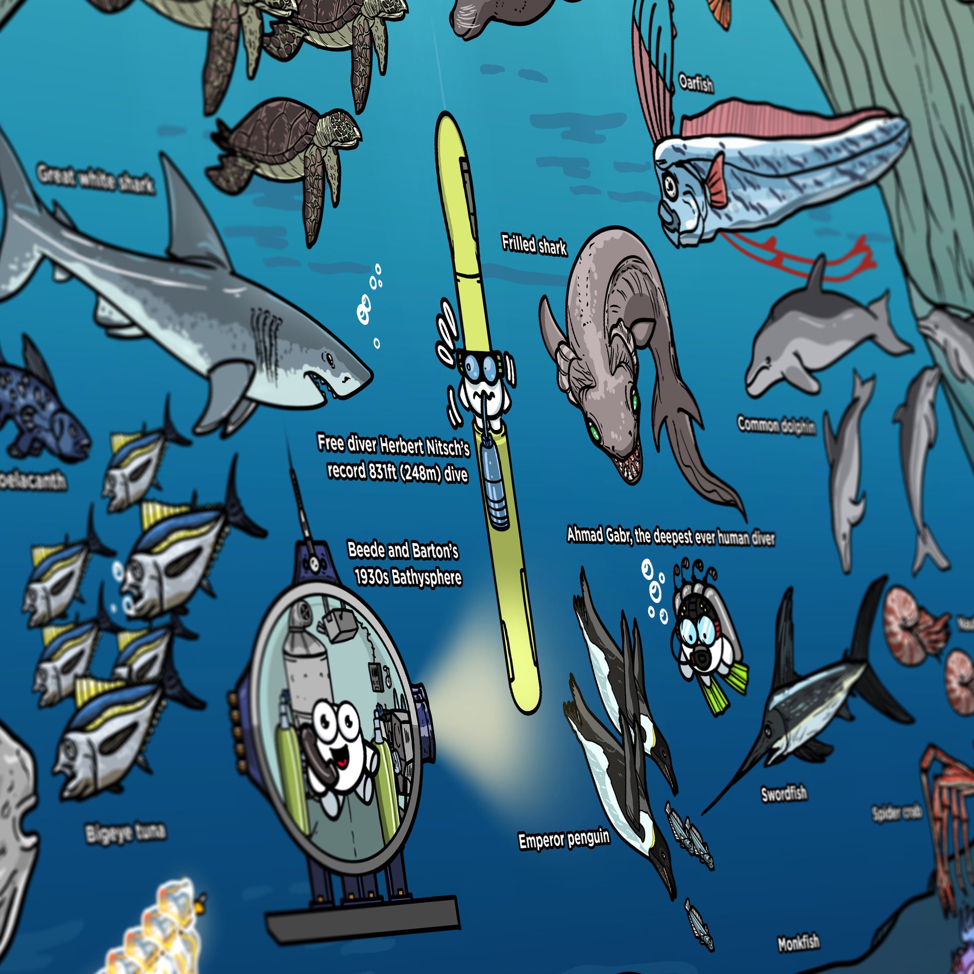 Our deep sea chart is hand-crafted and the perfect addition to any room. This immersive poster allows you to take a deep dive and explore the ocean with Bartholomew!