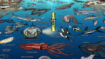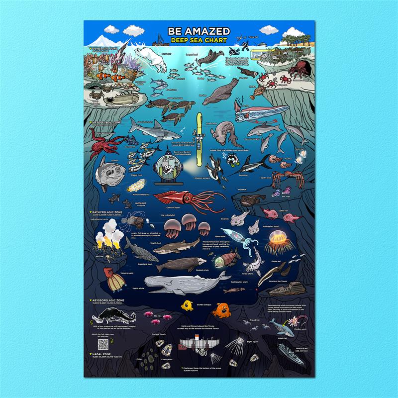 This beautifully illustrated poster depicts our journey into the deep blue sea. It defines the different ocean zones, the depths, and the marine creatures and landmarks that can be found in each of them.