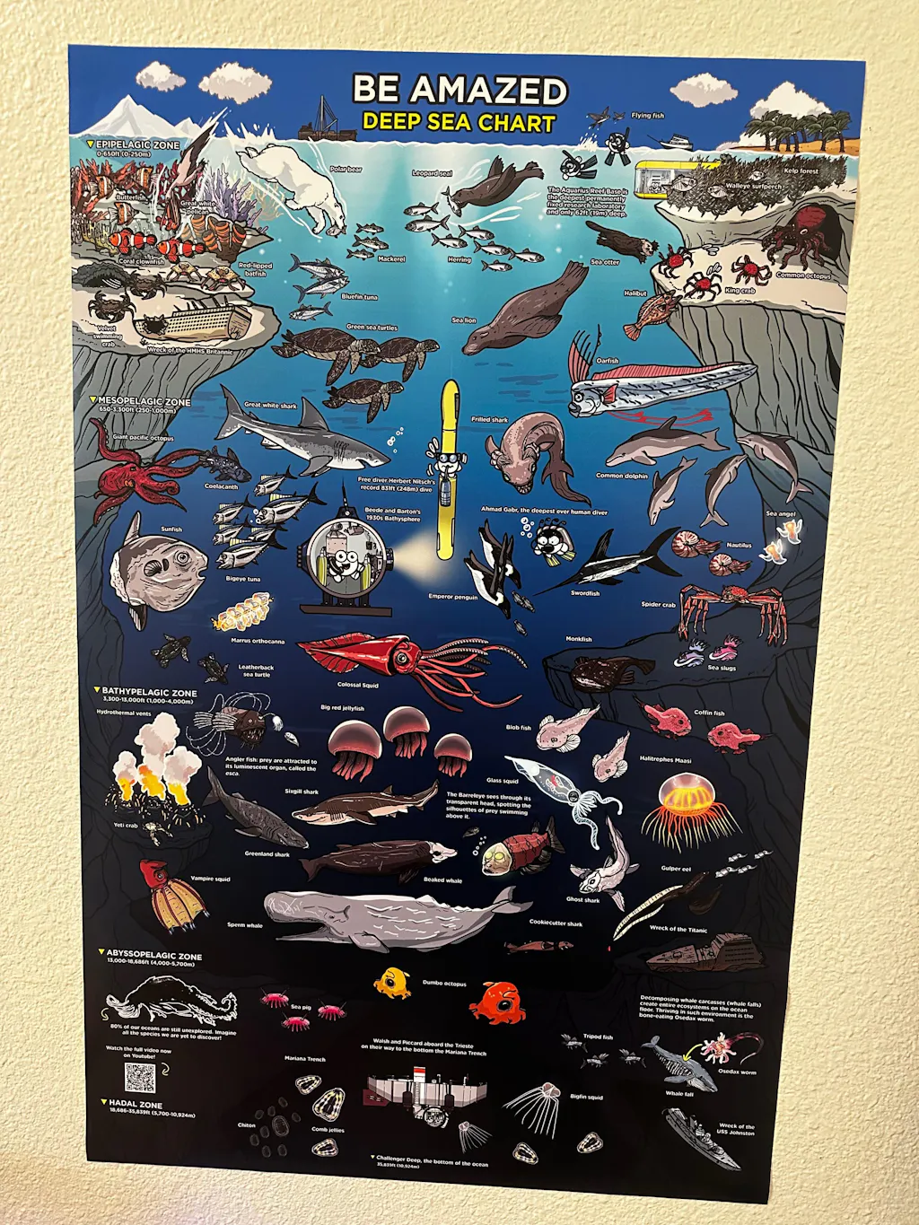 This beautifully illustrated poster depicts our journey into the deep blue sea. It defines the different ocean zones, the depths, and the marine creatures and landmarks that can be found in each of them.