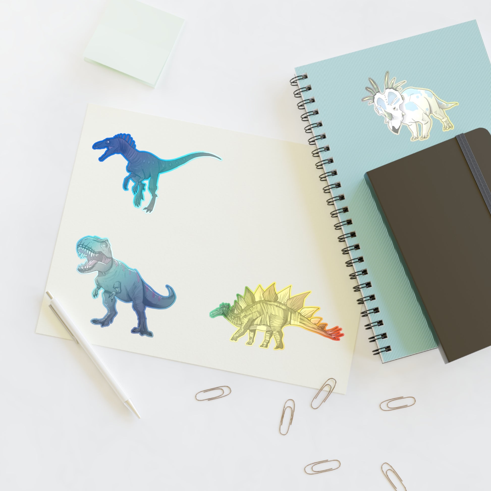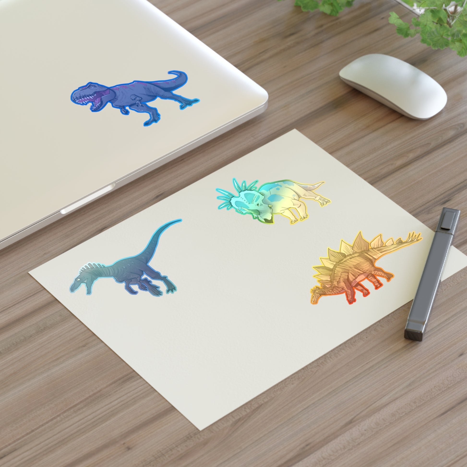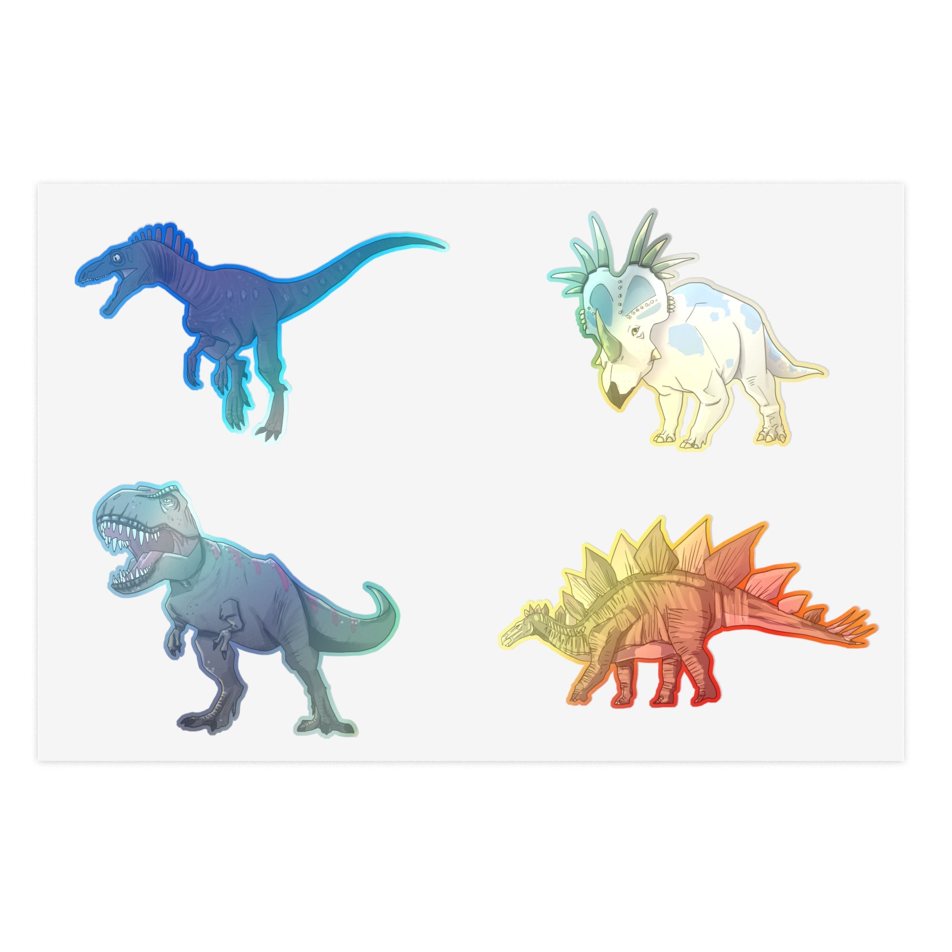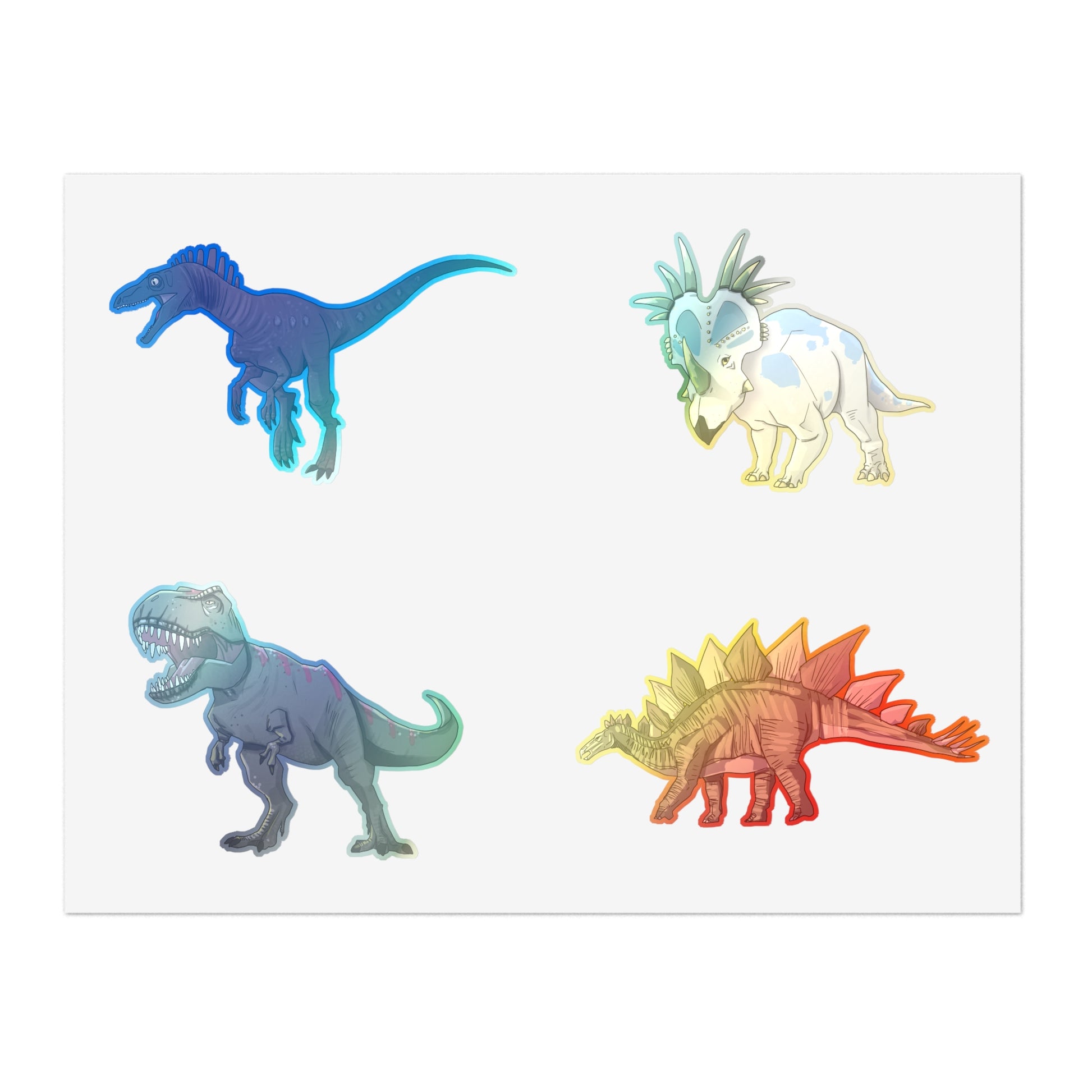 Decorate your surroundings with holographic dinosaur stickers! Featuring the Euroraptor, Styracosaurus, T-Rex and the Stegosaurus!
