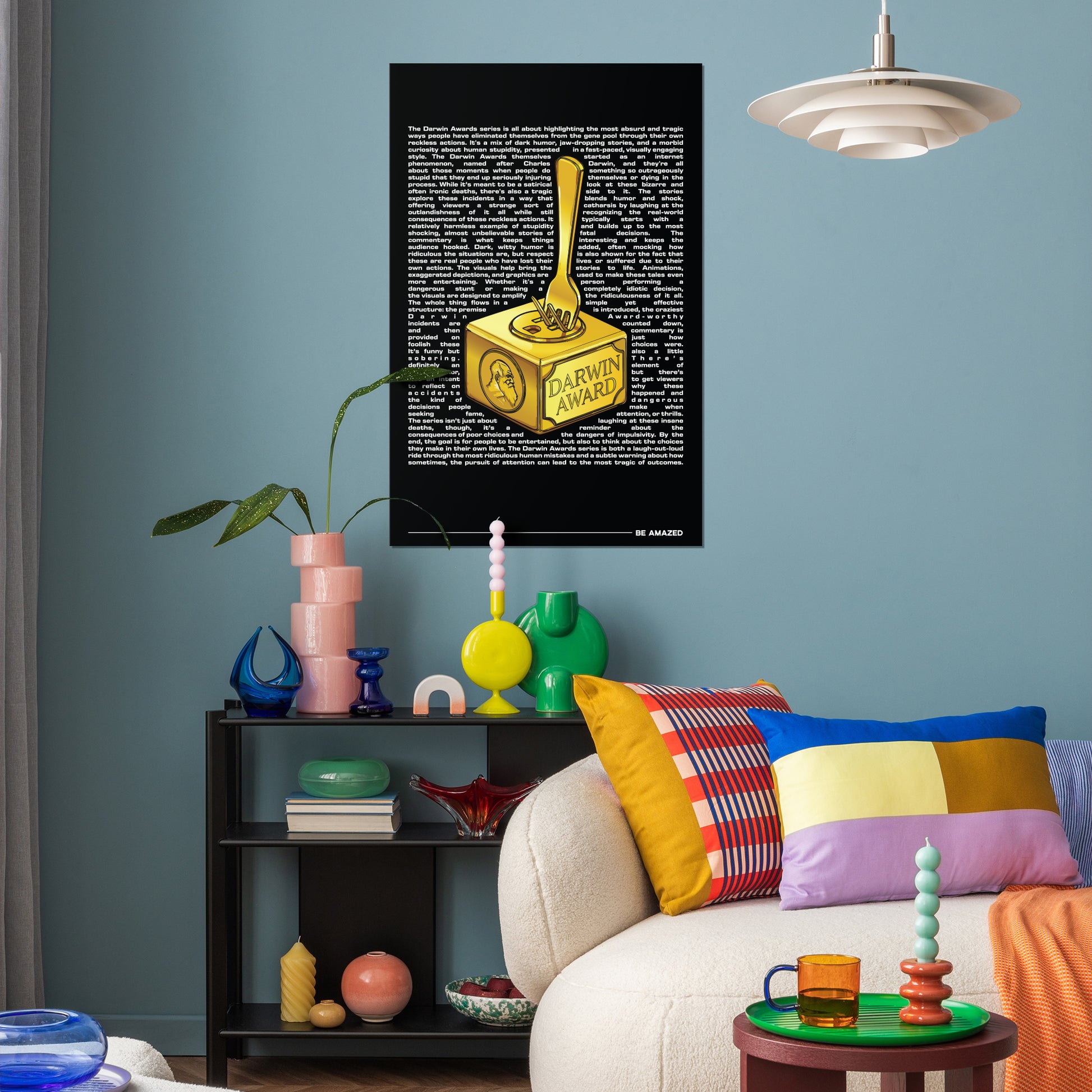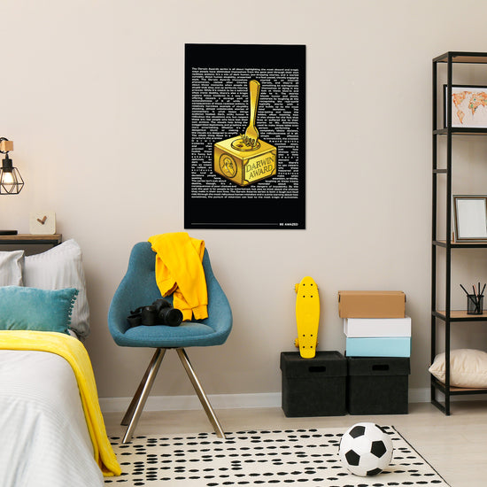 Smart design meets spectacular stupidity. This poster features the official Darwin Award trophy, a golden salute to humanity’s most mind-boggling moments of misfortune, surrounded by the story behind the series. It’s sharp, darkly funny, and guaranteed to spark conversation wherever it hangs.