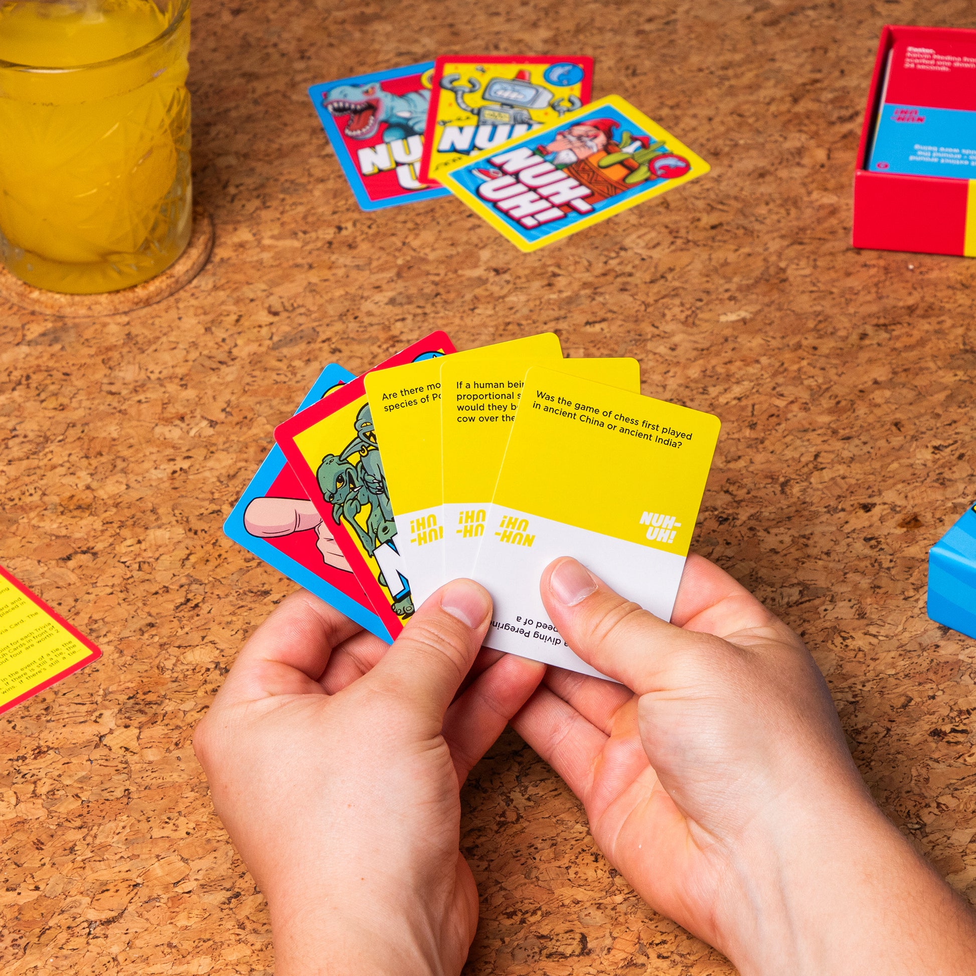 With over 1100 unconventional trivia questions, Nuh-Uh is an excellent addition to any party! Learn wild facts, put your skills to the test, and take big risks in the ultimate trivia party game!